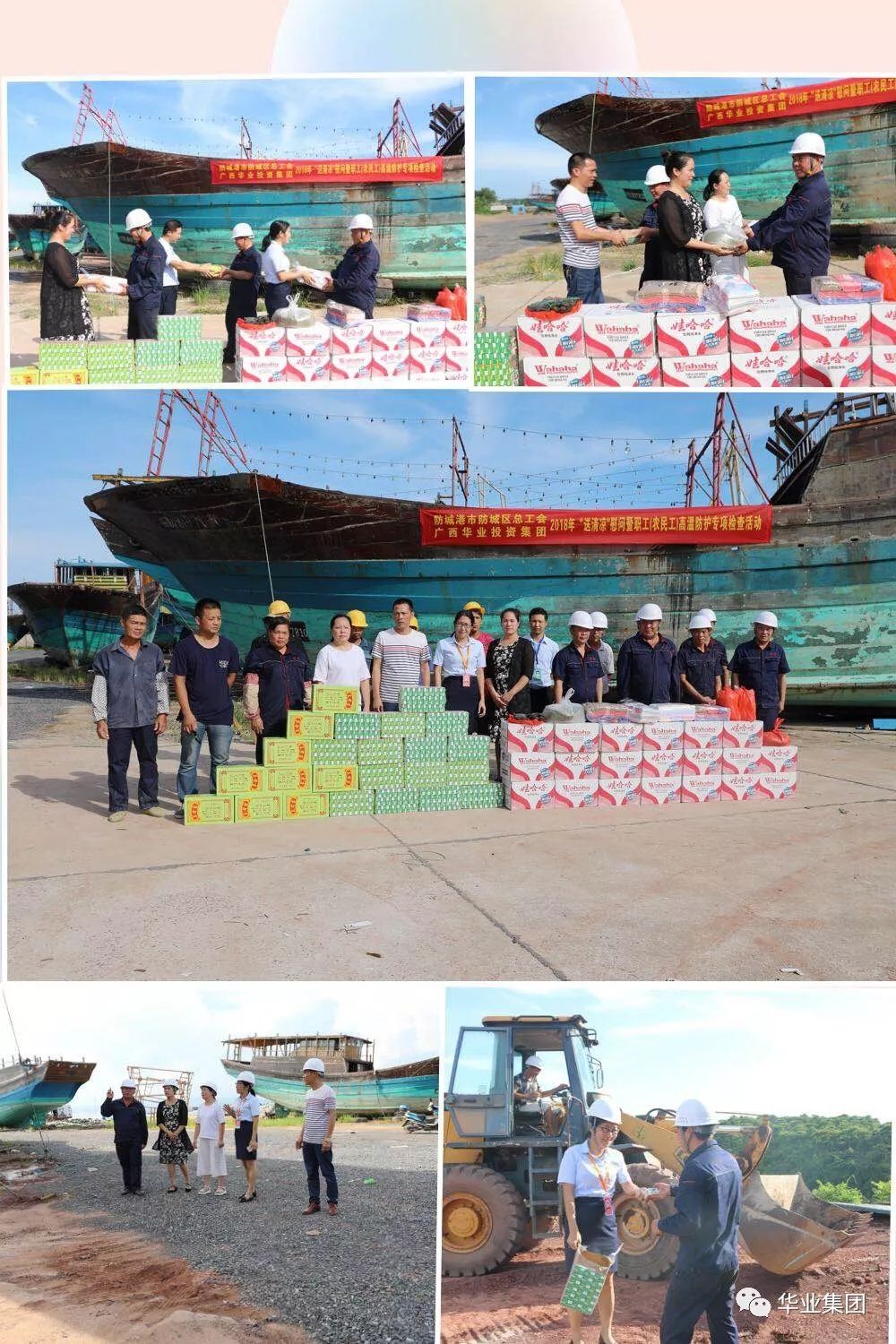 華業(yè)集團(tuán)夏日送清涼活動(dòng)產(chǎn)生了良好的社會(huì)影響,防城區(qū)總工會(huì)聞悉消息后,當(dāng)即決定雙方聯(lián)合組織開(kāi)展更多的深入工地送清涼活動(dòng),讓更多的在烈日下辛勤工作的工人朋友們得到關(guān)心、愛(ài)護(hù)和鼓舞。2018年8月7日下午,防城區(qū)總工會(huì)符皓副主席帶領(lǐng)工會(huì)干部與華業(yè)集團(tuán)工會(huì)鐘麗霞主席一行頂著烈日的熏烤,驅(qū)車(chē)前往白龍海邊防碼頭為漁光小鎮(zhèn)項(xiàng)目施工作業(yè)工人送清涼用品,并親切地慰問(wèn)了工人朋友們,給予深切的關(guān)懷和鼓舞。